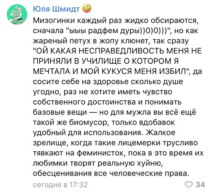 И ещё, у этих дамочек, у всех закрытый аккаунт. Видимо из каких-то целей. От греха подальше, я вчера на время свой тоже закрыла, мне в моей ленте не нужны дебилы.