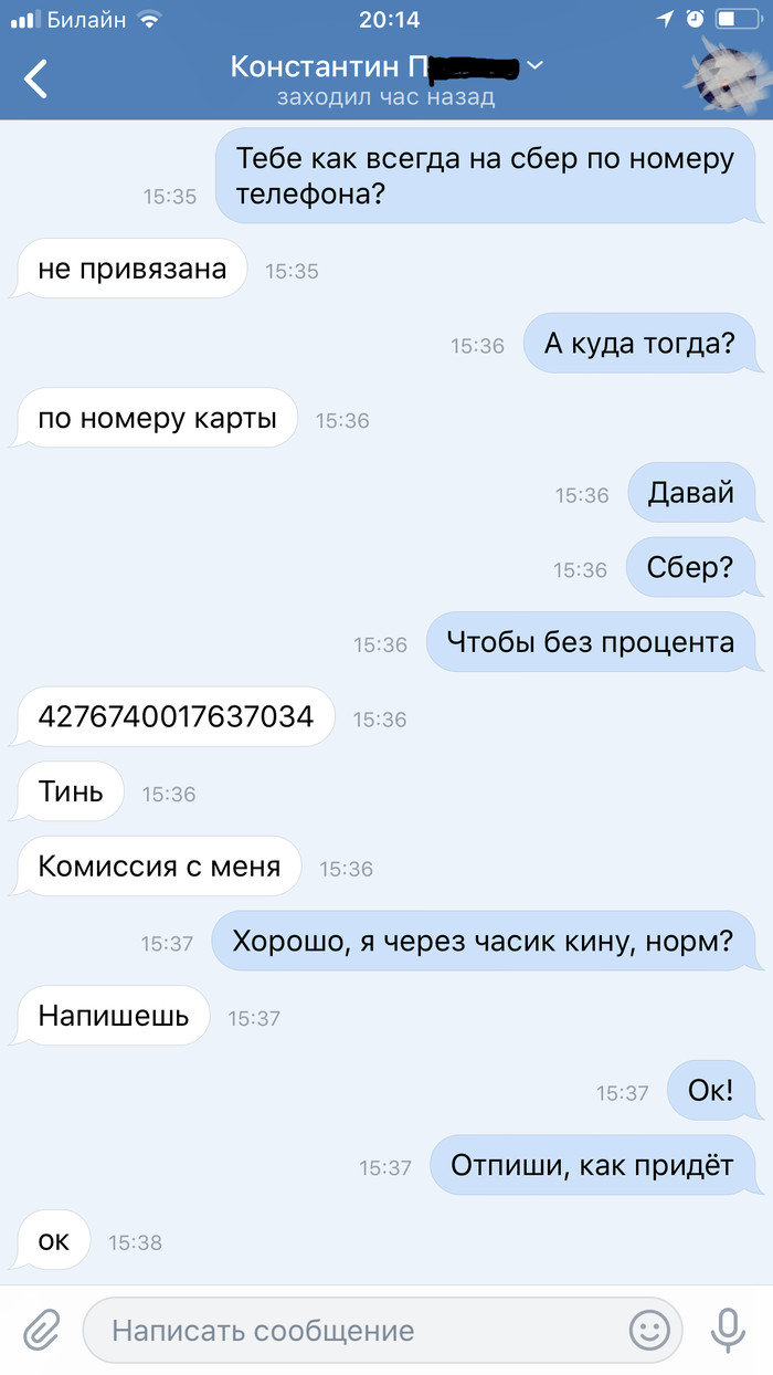 Сразу было понятно, что это мошенник (спасибо Picabu за навыки их определения :))), также друг мне до этого написал, чтобы я был готов к подобным сообщениям. И всё бы ничего, написал в суппорт ВК, сообщил о фейковой копии страницы. Написал в Тиньков, сообщил им об их карте для сомнительных операций.