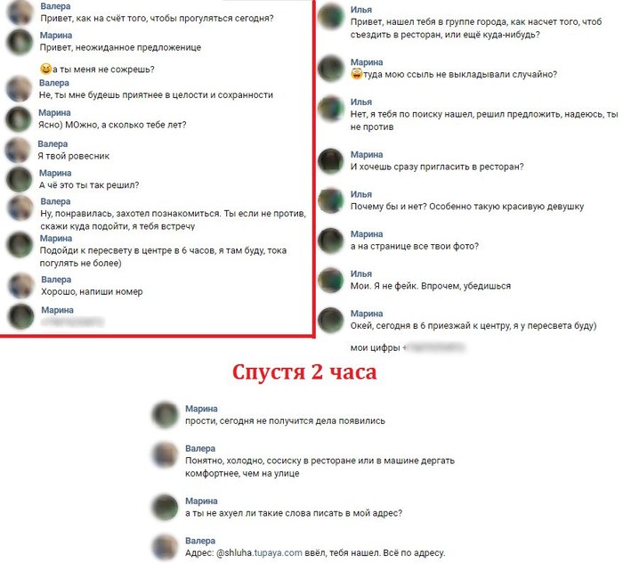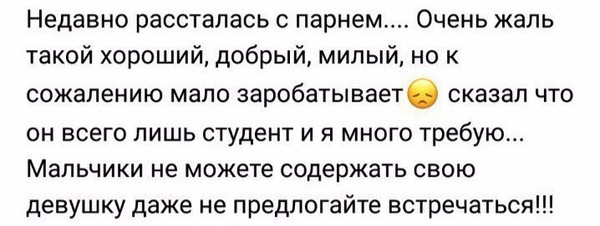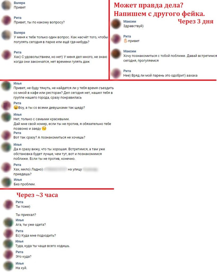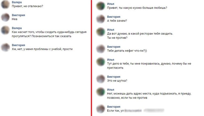 От автора, увидел недавно пост, в котором говорилось о том, что — "Я из тех девушек, котором не важно финансовое состояние парня" и бла-бла-бла, решил написать тем, кто репостнули запись, писал со страницы обычных парней, звал гулять, после чего, со страницы "можора" предлагал съездить, развлечься в ресторан. Что получилось, смотрите сами.