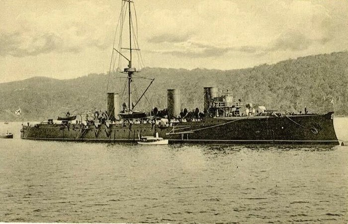 Уничтоженный во время атаки Emden крейсер «Жемчуг». Участник ещё Цусимского сражения, в Пенанге он находился в составе соединения союзников под общим командованием английского адмирала Джерама