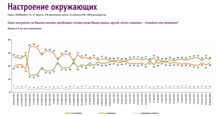 Последнее на данный момент исследование вышло 6 сентября. В нем эксперты оценивают состояние общества на стыке лета и осени. Полностью с ним можно познакомиться по ссылке. Мы же обратим только на один пункт, в котором ФОМ оценивает тревожность и спокойствие жителей страны.