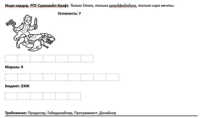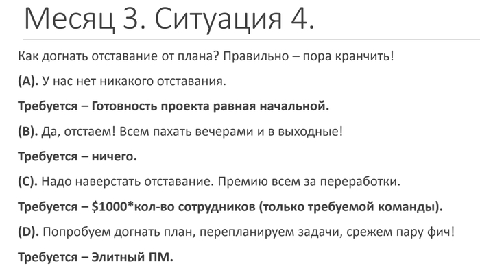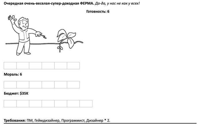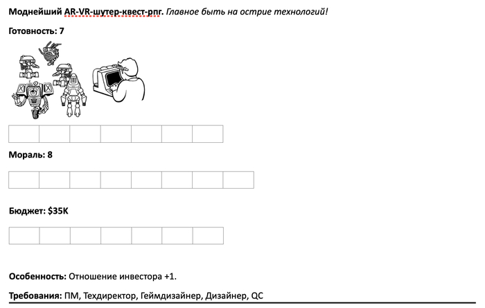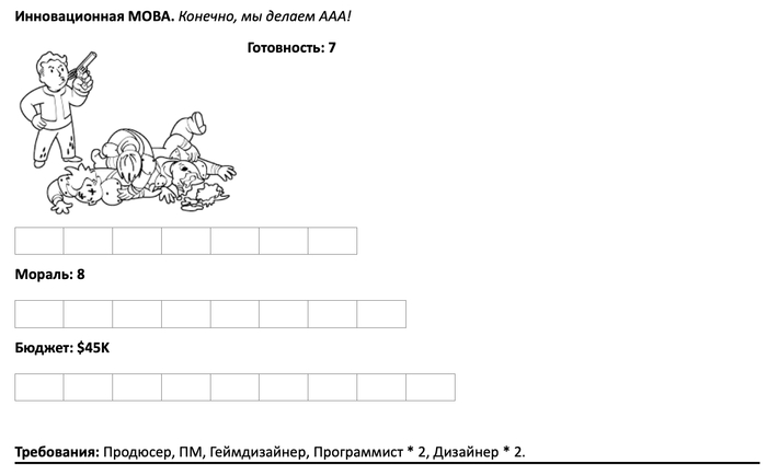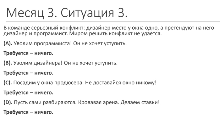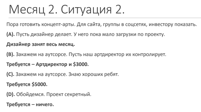 Нам предстояло набрать себе команду, исходя из бюджета, учитывая обязательные требования к наличию определённых специалистов. Потом мы сняли офис - и понеслось - начались игровые ситуации. Вроде таких.