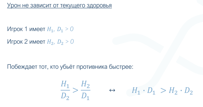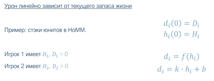 Далее мы ввели две характеристики: H как эффективное значение запаса жизни и D как эффективное значение наносимого урона. Делаем такое допущение: все другие параметры героя, армии и любого сражающегося субъекта могу быть приведены к этим двум. Они учитывают все другие характеристики, применённые эффекты и модификаторы, но не включают навыки игрока.