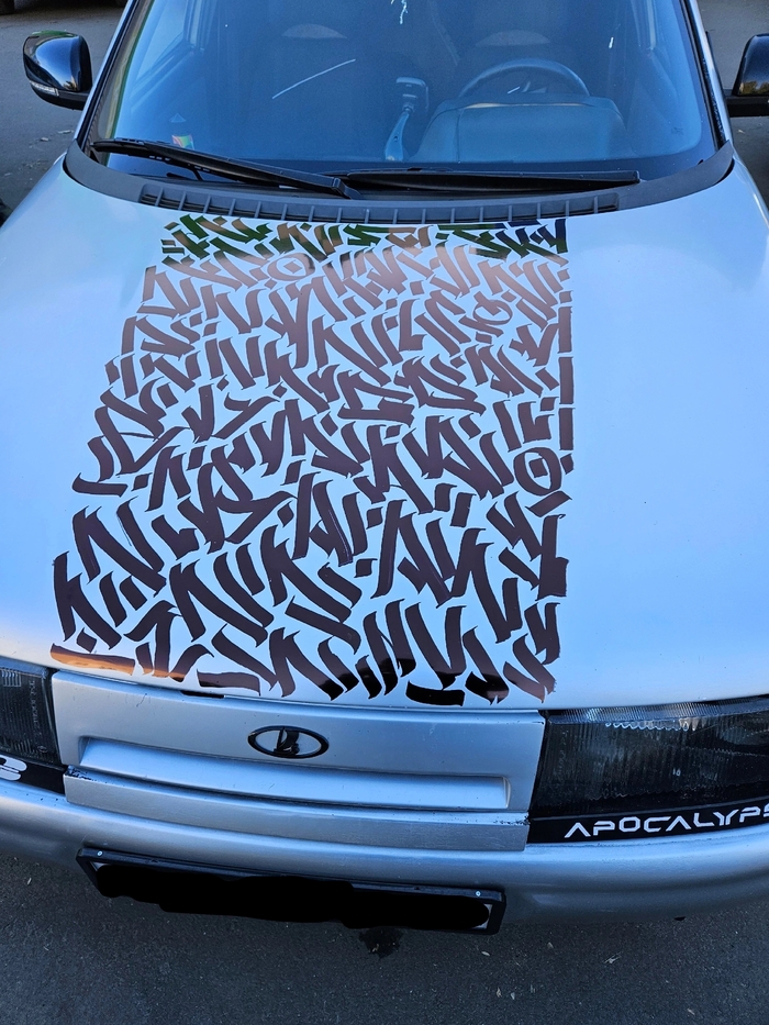 В одном из разговоров, он обмолвился что интересно было бы каллиграфией тачку украсить, но мы люди не сведущие в этой теме и я не побоюсь этого слова художников, этого стиля письма вот так просто на улице не найти.