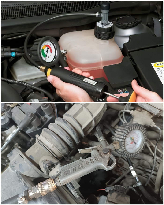 Визуальный осмотр не дал никаких результатов, везде сухо. Не текут ни патрубки, ни радиатор, ни печка, ни флейта, ни помпа. Поэтому начнём с опрессовки. Опрессовка — это проверка герметичности системы под давлением, превышающим рабочее. Слово опрессовка происходит от слова "пресс", а не "пресный".