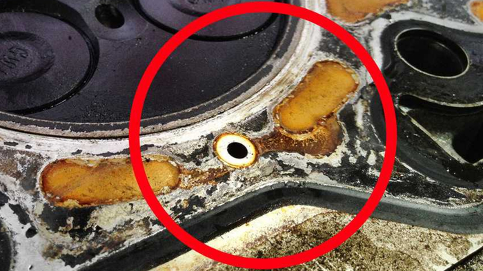 Хотя на видео конечно намного нагляднее и интереснее видно, как по стенке блока стекают капли антифриза. И это без давления. Кстати, антифриз из системы охлаждения может попадать в цилиндры или систему смазки не только через прогар или пробой прокладки, но так же через раковины под ней или трещины непосредственно в головке или блоке.