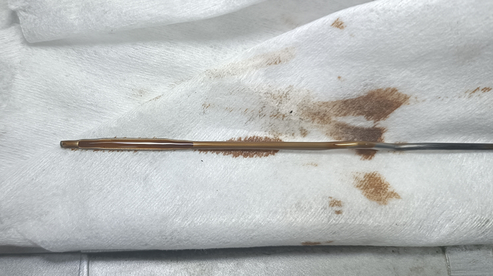 Достанем масляный щуп. На лицо более чем двукратное превышение уровня и странный цвет масла.