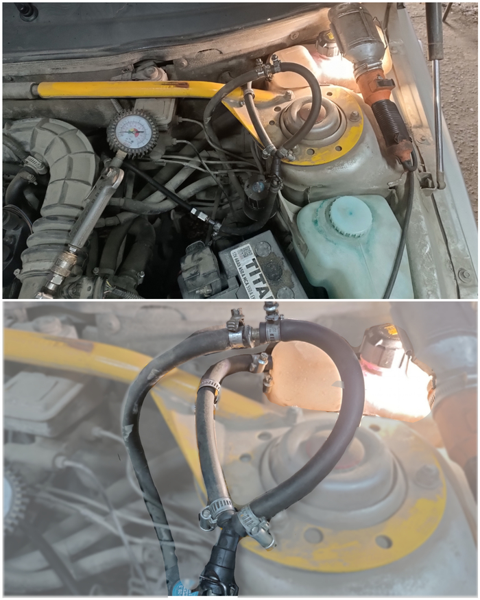 Рабочее избыточное давление на автомобиле ВАЗ — примерно одна атмосфера, поэтому накачиваю не больше 1,2 — 1,5, а крышка расширительного бачка сбросит лишнее, ведь я подключился тройником, а не через неё. Плюс такого подключения — возможность проверить крышку. Она должна держать давление примерно до одной атмосферы, но сбрасывать лишнее. Если это нет так, система охлаждения не будет работать нормально. Недостаток давления снизит температуру кипения, что вызовет выброс антифриза из бачка до включения вентилятора, а избыток давления приведёт к появлению течей или повреждению элементов системы.