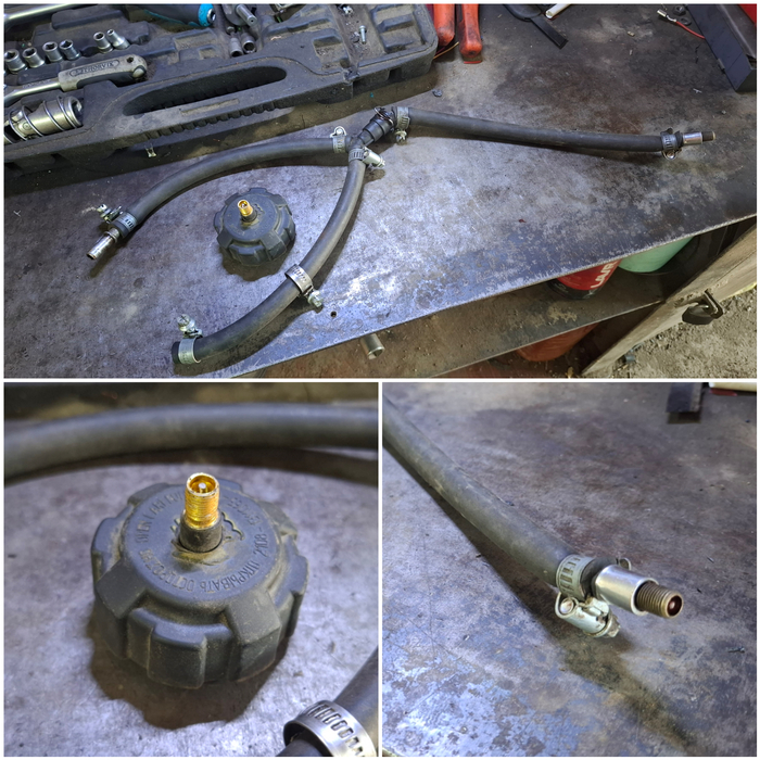 Подключаем тройник в разрыв любого из патрубков системы охлаждения или накручиваем крышку-переходник на расширительный бачок.
