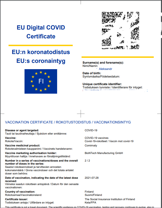 Коронапаспорт – это свидетельство о полном курсе вакцинации от коронавируса, о перенесенном ковиде или отрицательном результате теста, проведенного в течение последних 72 часов. Коронапаспорт соответствует европейскому зеленому сертификату, по которому можно путешествовать по ЕС и въезжать в Финляндию без прохождения тестов на границе.