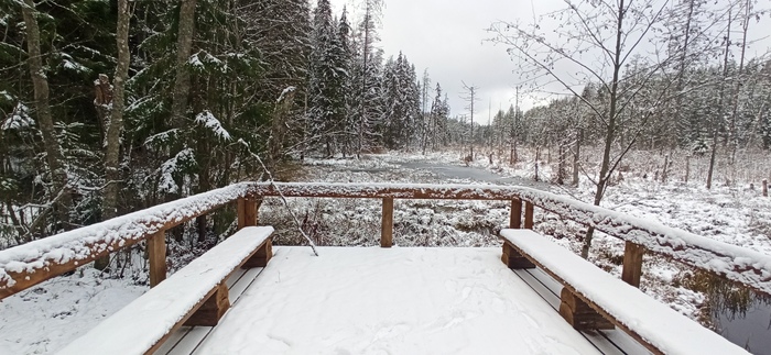 Мы поехали на маршрут 3 ноября, за пару дней до этого выпал снег и вместо осеннего леса мы получили зимний) однако это только скрасило наш путь, так как места куда снег не попал выглядели грязно серо, так как в этом районе достаточно сыро (по крайней мере в это время).