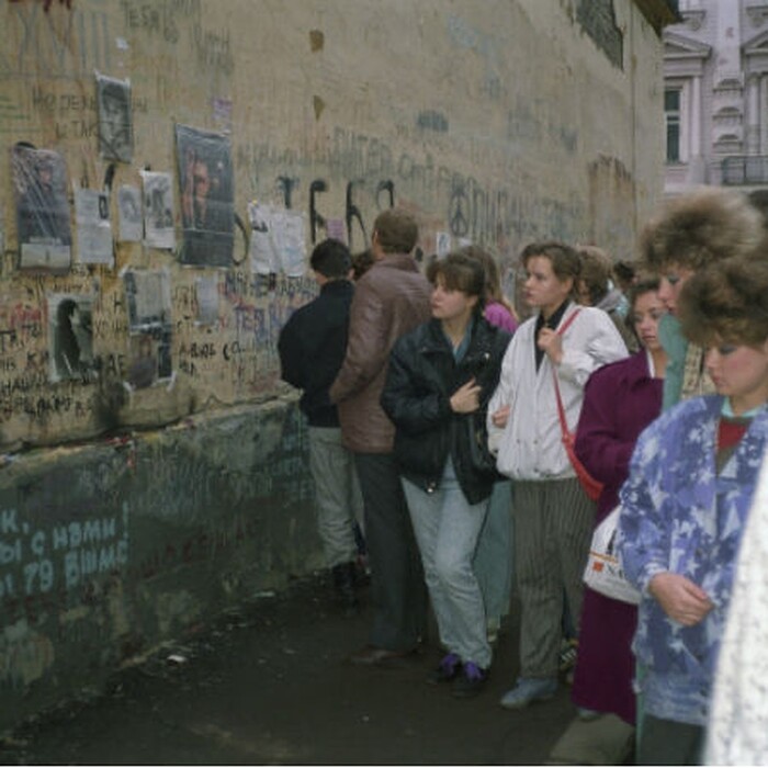 Люди возле стены Цоя в Москве, 1990 год.