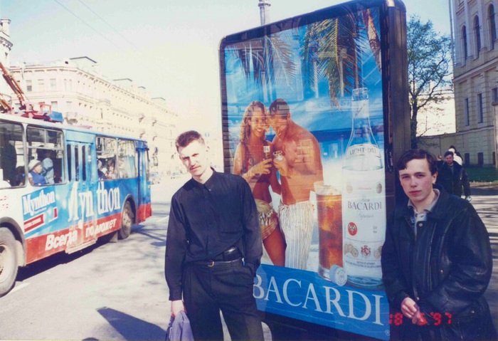 Парни на фоне рекламного плаката с ромом. Россия, 1997 год.