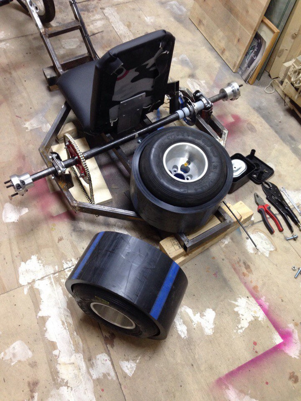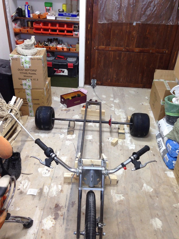 Мы начали строить без особых знаний о тех. части, основываясь на картинках и немногочисленных чертежах в открытом доступе. Купили ось с креплениями, ступицами, звездой, подшипниками и резиной от картинга (все б\у) + лежал в гараже мини спорт-байк (можно обойтись и без него, просто нужен донор передней вилки и деталей управления).
