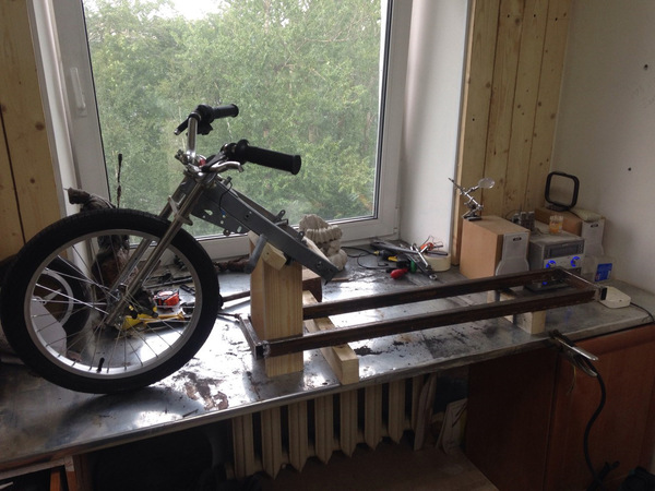 Начали делать раму без замеров двигателя и кресла (их просто не было), с одной только осью. И не подумав о центре тяжести задумали принцип "качели": по центру ось, спереди седло, сзади двигатель. и ось поставили четко по центру. Да, впереди еще будет часть рамы от мини и колесо, да и закон рычага никто не отменял, но, забегая вперед, это отразилось в том, что если откинуться в кресле назад то без особых затруднений можно на месте поднять переднее колесо.