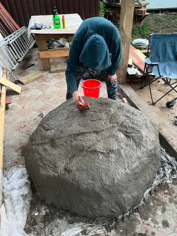 Потом сделали что-то вроде бетонного папье-маше. из кусков старой серпянки. И обмазали этот котях снаружи. Подождали пару дней и нанесли скульптурный слой из того же бетона со стеклянной фиброй и клеем ПВА. Консистенцией такой чтобы из него можно было лепить. На этом этапе решили отказаться от кратеров и прочего межгалактического продукта, потому как слой для этого получился бы толщиной сантиметров 15-20, и крышку пришлось бы ворочать краном. Обычной кисточкой вылепили на поверхности рельеф. Кисточкой надо просто тыкать в эту массу - тогда получается довольно естественно.
