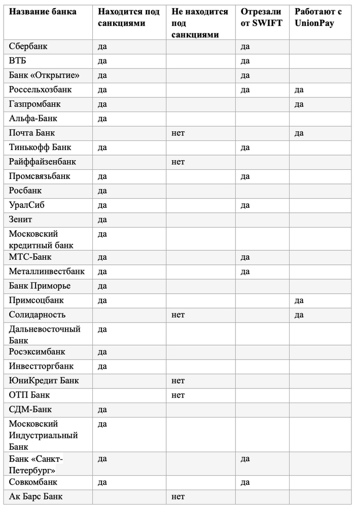 В таблице рассмотрим, какие банки попали под санкции, какие нет, тех кого отрезали от международной платежной системы SWIFT и какие работают с UnionPay – картой, которая стала «палочкой-выручалочкой» для тех, кто любит заграничные поездки.