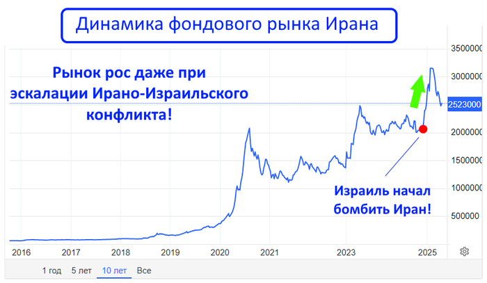 После обстрела Ирана со стороны Израиля в октябре 2024г, тегеранская биржа также не показала паники, а напротив, резко ускорила свой рост: