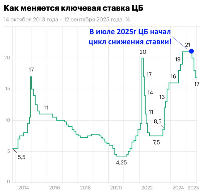 Цикл снижения ключевой ставки начался в июне 2025г, именно тогда ЦБ впервые за 8 месяце снизил ставку с 21 до 20%: