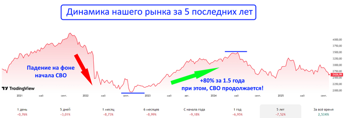 Несмотря на продолжение конфликта, индекс МосБиржи показал рост более чем на 80% за полтора года (2023-2024г). Это наглядное доказательство, что рынок может расти даже в напряженной геополитической обстановке: