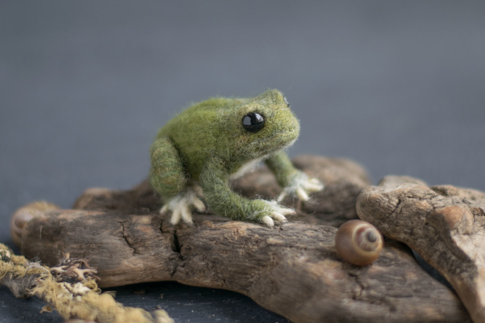 Внутри проволочный каркас, сверху овечья шерсть, глаза из полимерной глины. Я валяла неплотно, в технике "шерстяной импрессионизм", на лягушку ушло около 4 часов вместе с подготовкой