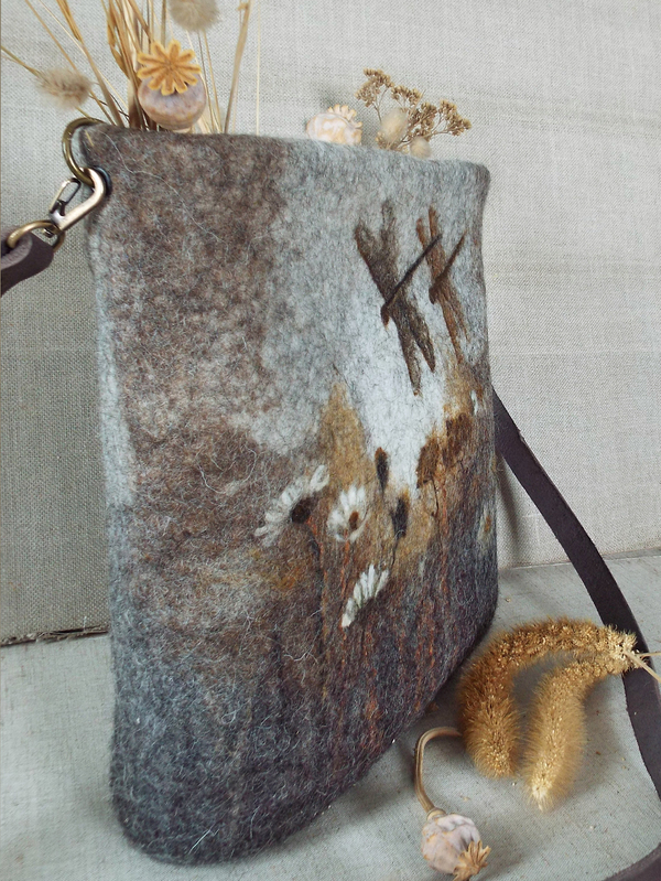 Живописная сумочка, выполненная на полутонах из натуральной шерсти разных оттенков. Плотная, упругая. Внутри цельноваляный кармашек. закрывается на 2 магнитные кнопки. Лямка из натуральной кожи.