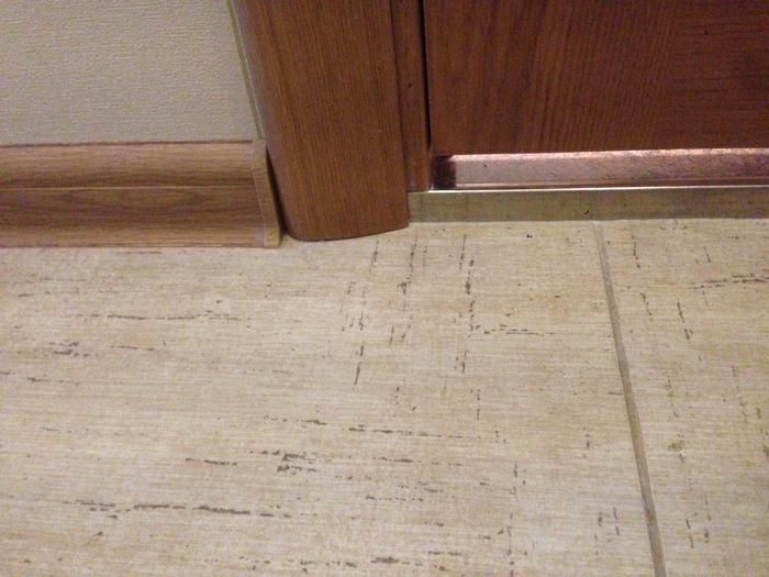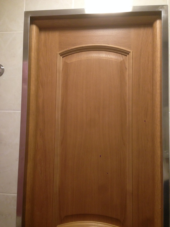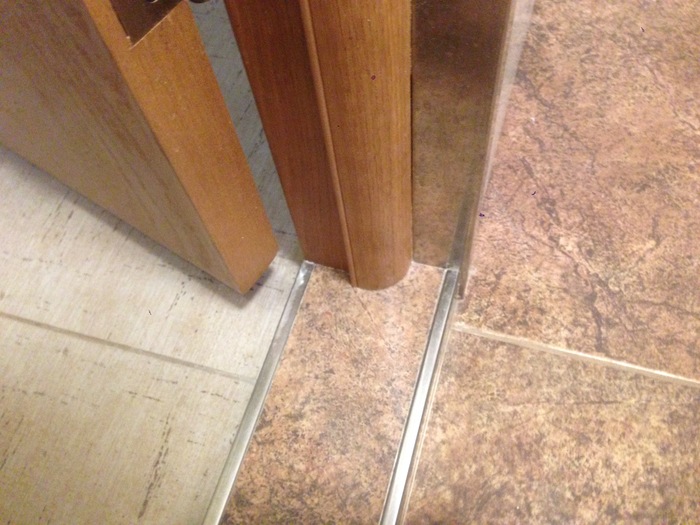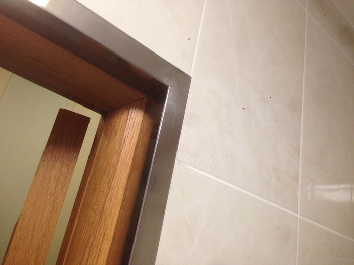 Снести все старое не всегда разумно да и не всегда возможно. У меня стена в ванную сложена из кирпича на ребро. Плюс штукатурка, плюс кривая, получилось порядка 100 мм толщиной. Стандартный ( условно) косяк имеет ширину 75 мм, не то ни сё. Т.е. нужен добор. Дерево в ванной не очень хорошо стоит, видел, как разбухает из-за сырости, шпон вспучивается. Далее, в ванную нужен порог. У меня изначально высота пола в ванной была больше, чем в коридоре. Т.е., вся пролитая вода вытекала в коридор. Нужно, на мой взгляд, делать высоту пола в ванной ниже, чем в коридоре. Далее, наличники. Их опускать до пола или до порожка. До пола – плохо по причине намокания, до порожка – не красиво. Все эти аргументы привели меня к конструкции добора-наличников из нержавеющего профиля 40х30мм. Нержавейка вполне уместна в ванной, т.к. присутствуют хромированные краны, полотенцесушитель и другие блестящие элементы. В мастерской я сделал портал в виде буквы «О» из профиля, вклеил его в проем со стороны ванной. Затем сформировал порог. Одна из стенок порога ( внутренняя) является частью портала. Вторую установил на месте. Порог у меня получился на 20 мм выше пола в коридоре и на 40 мм выше пола в ванной. Порог состоит из двух параллельных нержавеющих профилей, между которыми положена плитка. Сначала ставятся профили и скрепляются между собой проволокой (в профилях с внутренней стороны сделаны отверстия для этого) и заливаются жидким раствором типа наливной пол. Затем вклеивается плитка между профилями.