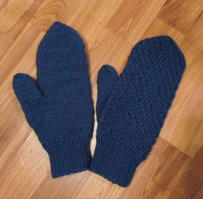Первые носки и варежки меня научила вязать бабушка лет 20 назад. Знаете, такие простые и уютные. Пока дочь была маленькая, в основном, вязала для нее. Но тут муж опечалился, что замшевые перчатки нельзя стирать, и он хочет попробовать варежки. Да запросто. Темно-синяя полушерсть Пехорка "Мериносовая" 200 м/100г, круговые спицы намба 3. Ушло около 70 г.