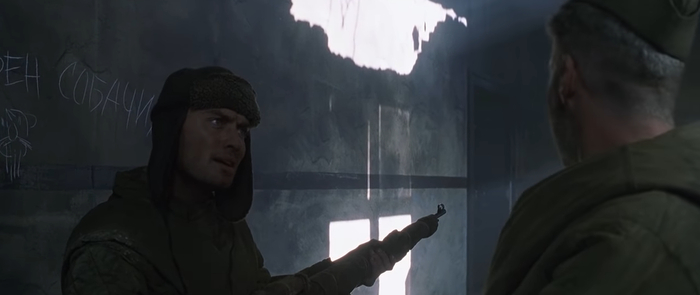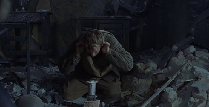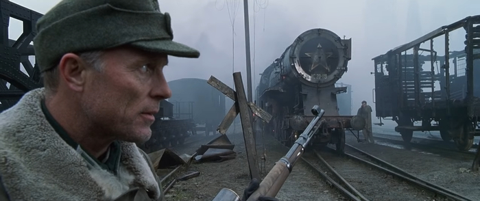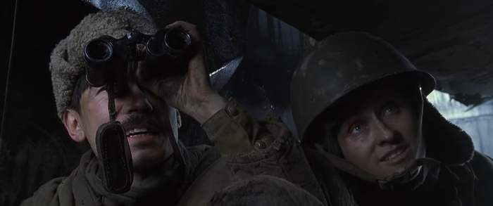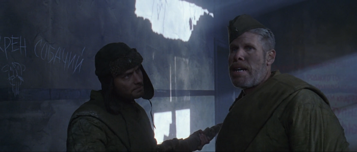 А теперь посмотрим на советского снайпера: он труслив, плаксив. Да и вообще, походит не на офицера Красной армии, а на изрядно потасканного привокзального бомжару (растрёпанный, немытая физиономия, грязный рваный ватник). На протяжении всего снайперского противостояния, Зайцев, по фильму, всем пытается доказать, что немца ему не победить. Типичные цитаты Зайцева: “он лучший”, “мне не справиться с ним”, “это он убьёт меня, а не я его”. Канючит и канючит без конца и края.