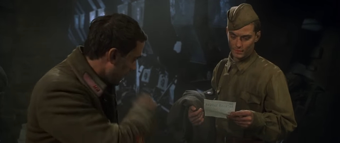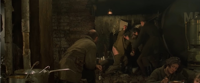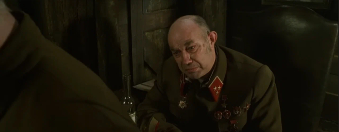 Зайцев смотрит на труп убитого товарища и понимает, как он чудом избежал смерти и распускает нюни. В это время, в штабе Хрущев и политрук Данилов, во всю хлещут водку за Победу. Хрущев жалуется на то, что снайперская дуэль слишком затянулась. Данилов выгораживает друга и говорит, что Зайцев изучает немецкого снайпера и на это надо время. На это Хрущев говорит:-Водка у нас есть. Икра тоже у нас есть. А вот времени нет. Ну действительно, куда в фильме про русских , да без водки.