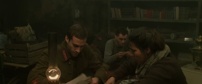 Ободренный зарядом водки, Данилов начинает подкатывать к связистке Тане, к которой проявляет любовный интерес. В качестве презента дарит девушке завернутого осетра, что он позаимствовал находясь на приёме у Хрущева. Таня просит у возбужденного политрука, перевести её в снайперы, так как фашисты зверски убили её родителей