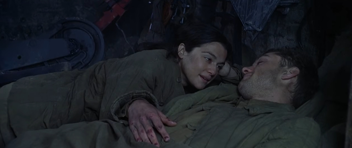 В это время политрук Данилов терзаемый муками ревности передает мальчишке Сашке, что бы он передал Кёнигу информацию, что всех снайперов отправят на штурм завода и что Василий Зайцев тоже будет там. Татьяна же терзаемая влечением к Василию, приходит к нему и ложиться рядом с ним, среди спящих тут же рядом красноармейцев. И между Зайцевым и девушкой происходит любовная сцена. Рядом значит бойцы Красной армии лежат, а эти двое между ними любовью занимаются, вместо того что бы отойти куда ни будь, ладно хоть сценаристы групповуху устроить не решились для полной достоверности..