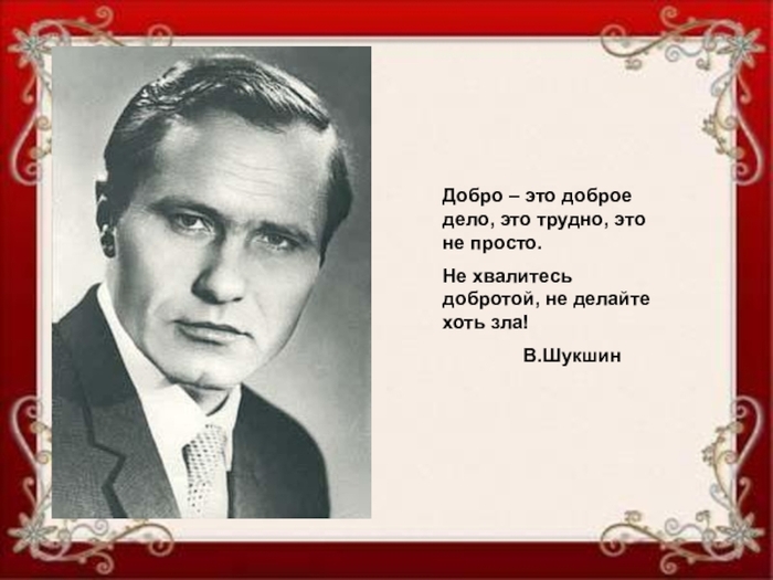 «Нравственность есть Правда. Не просто правда, а — Правда. Ибо это мужество, честность, это значит — жить народной радостью и болью, думать, как думает народ, потому что народ всегда знает Правду... Из всех сил буду стараться рассказать правду о людях», - так сам Шукшин определял свой творческий «метод».