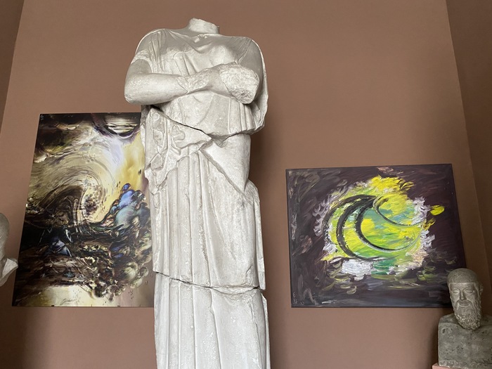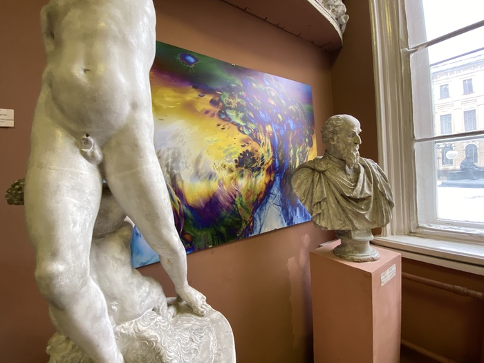 Также полотна и металлические скульптуры размещены в отделе гипсовых слепков. Аляпистые квадраты и прямоугольники расположены среди античных скульптур. И это в общем-то сглаживает восприятие. Но далеко не для всех. Ректор академии назвал выставку "конем в сенате". Логичный вопрос: зачем тогда размещать? Музей и университет - это две разные структуры. Одна другой не подчиняется.