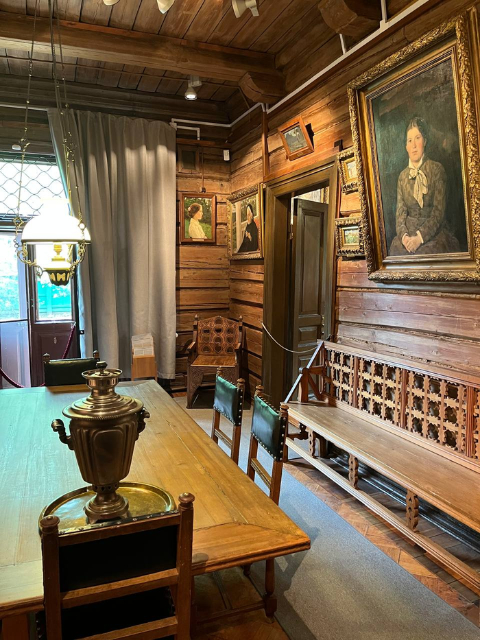Первое помещение на пути - столовая с печью нежно-розового цвета. В центре комнаты стоит большой сосновый обеденный стол, изготовленный неизвестным московским мастером конца XIX века.