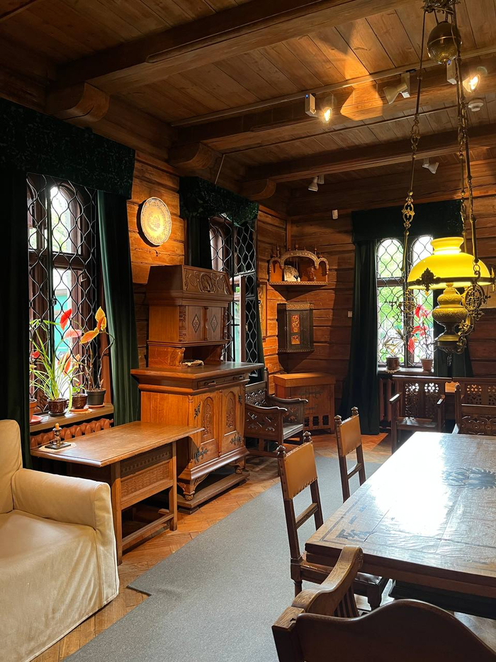 Далее у нас идет гостиная. Обстановка гостиной почти полностью сохранена; как и во всем доме, она продумана самим художником.