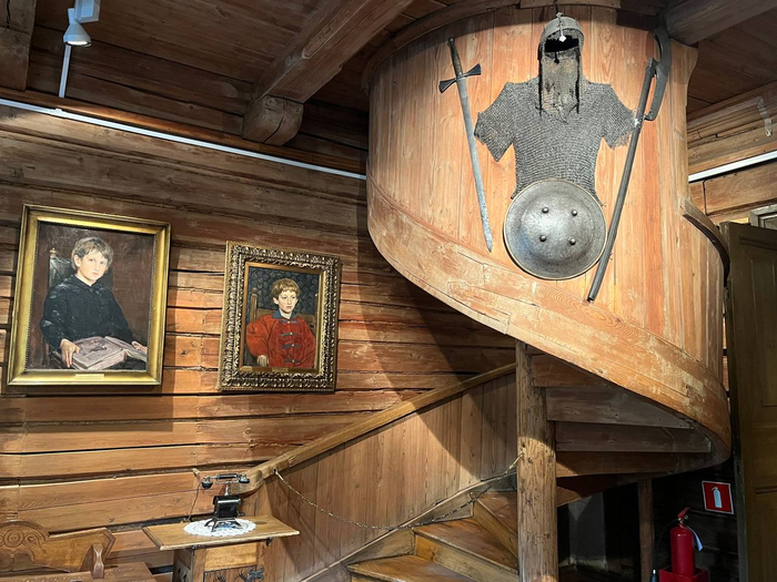 Из гостиной в мастерскую на второй этаж ведет винтовая лестница, на которой закреплены доспехи. Они были нужны художнику для создания богатырских образов. Иногда Васнецов поощрял своих младших детей и племянников, которые выступали в роли моделей для картин, возможностью примерить древнюю кольчугу и щит.