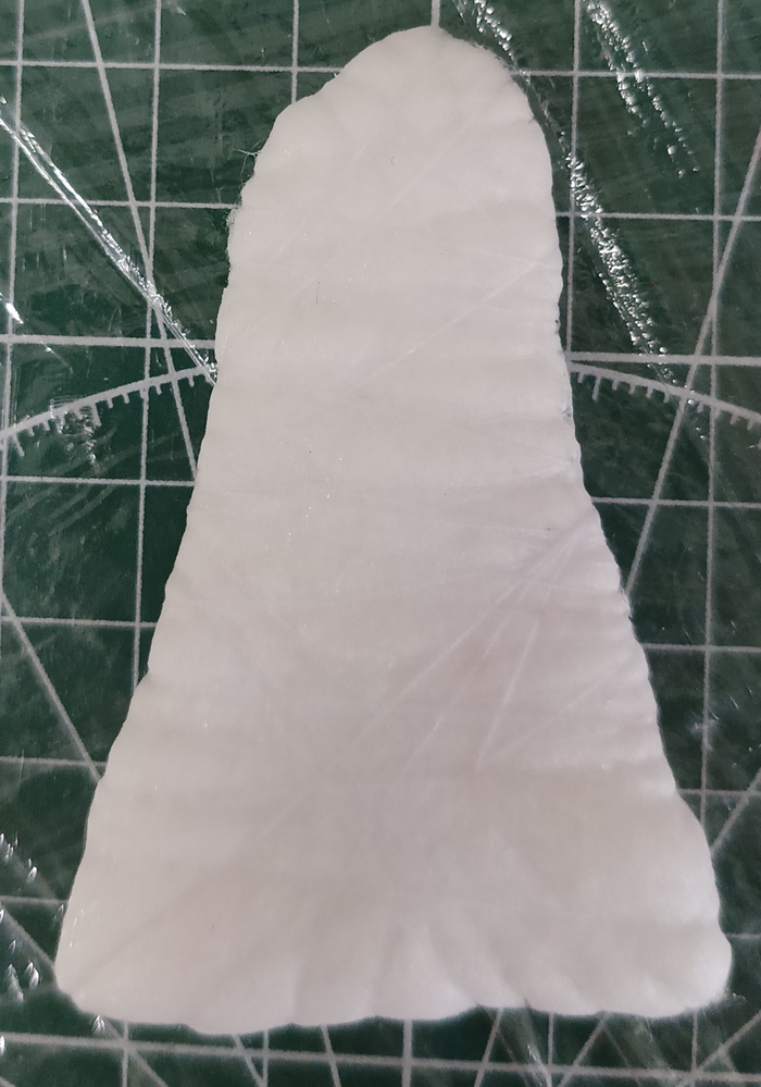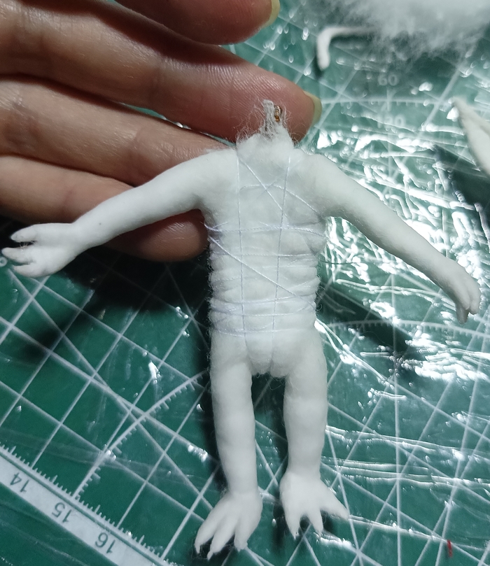 3. Тело обматываю ватой и фиксирую нитками. Затем уже кластером и полотном ваты формирую складки.