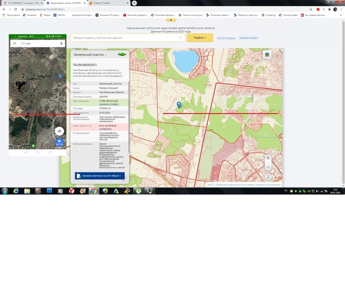 Место совпадает с кадастровой картой. Горизонтальная красная линия показывает, что положение карьеров на снимке совпадает с положением участка относительно улицы Бейвеля. По вертикали положение и там и там совпадает относительно озера в Моховичках.