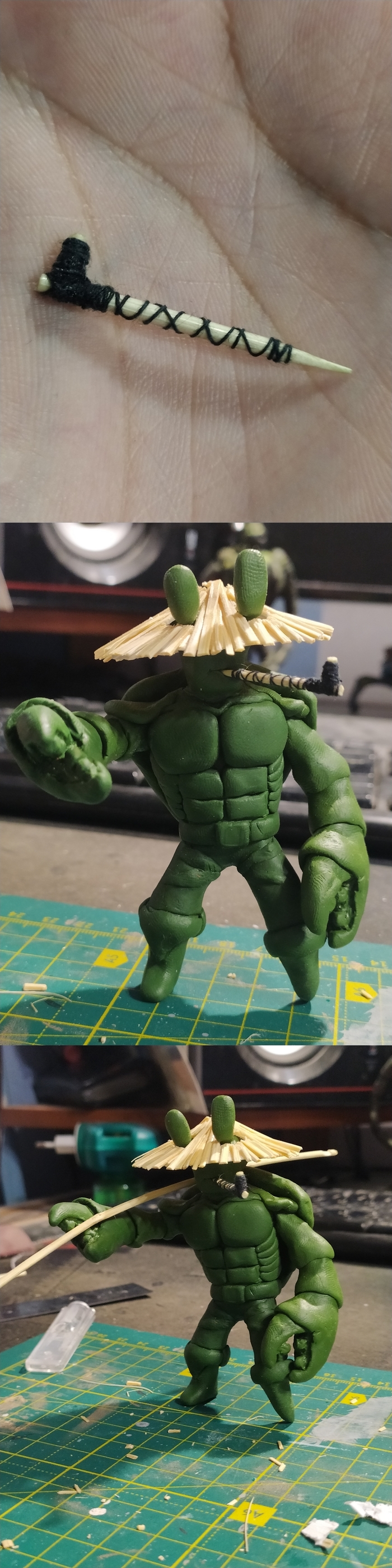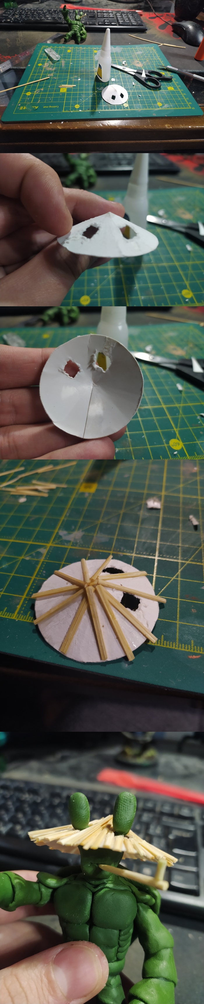 Резал шпажки на части и раскалывал на пополам. И уже их приклеивал на каркас. Намаялся сильно. Из-за того что детали маленькие, клеит нужно на супер клей. А он обладает какой то космической текучестью. В итоге пару слоёв кожи с пальцев, пришлось удолять методом згрызывания)))