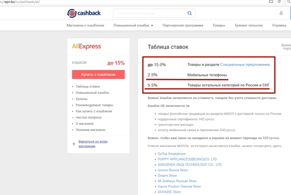 Обратите внимание на ставки кэшбэка по Алиэкспресс. Причем, у сервиса ePN совсем нет данных по Алиэкспресс. И дата регистрации информации стоит 13-14 августа 2017 года.