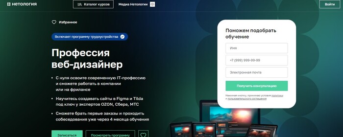 2. Профессия Веб-дизайнер [ Нетология ] — 6 месяцев обучения с нуля, 56 часов теории и 116 часов практики. Работа в Figma и Tilda, создание сайтов любой сложности. Возможность первых заказов уже через 4 месяца. Поддержка кураторов, партнёрская программа трудоустройства (MTC, Lamoda и др.)