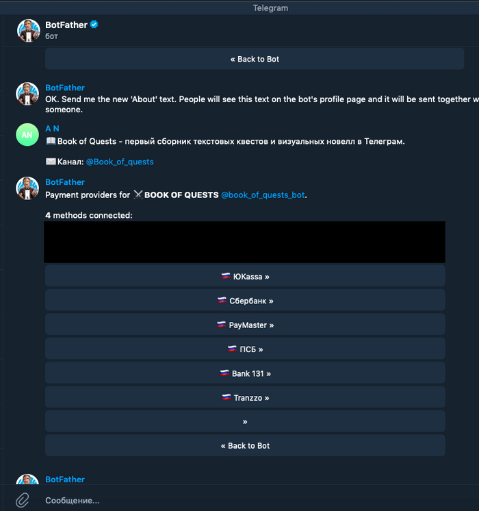 Так как этот вариант отвалился, мы начали изучать другие способы оплаты через Телеграм: