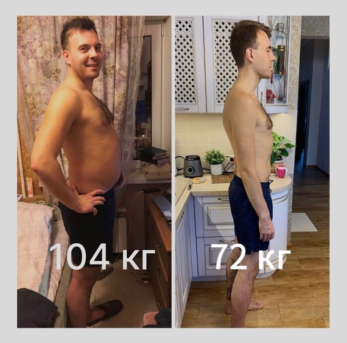 В начале апреля 2021 года я почитал некоторые книги, посмотрел кое-какие интересные документальные фильмы и…готовы? Также одним днем отказался от мясо – молочной продукции, рыбы, и вообще всей вареной/жареной – читай термически обработанной, еды. Стал питаться естественной растительной пищей. И только ей. Эффект был молниеносен и шокировал все мое окружение – в период с 1 февраля по начало мая я сбросил 32 кг и мой вес составил 72 кг! Фото-коллаж для наглядности прилагаю ниже.