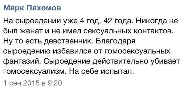 все же восторгов от сыроедения не так много. Больше жалоб. Во время прогулки по СЕ форумам я поражался, до чего изводят себя многие молодые люди. Рассказывают, до чего докатились на сыроедении… страшные вещи пишут. И при этом даже не думают прекращать эксперименты… Не понимаю!