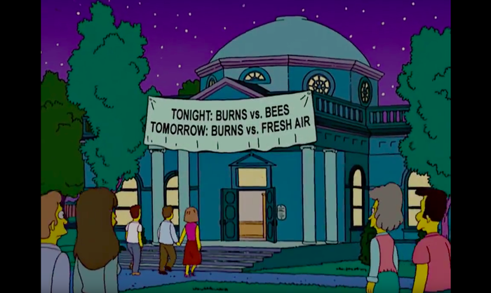 Против Бёрнса подают иск, однако он с лёгкостью убеждает горожан в необходимости строительства стадиона. Однако Гомер Симпсон, желая утешить Лизу, скрещивает местных пчёл с африканскими. Полученный «термоядерно» опасный вид выбирает в качестве улья новый стадион, разогнав всех спрингфилдцев. Лиза ликует, а Бёрнс грозится взять реванш. Но его планам мешают пчёлы, которые уносят Монти со стадиона.