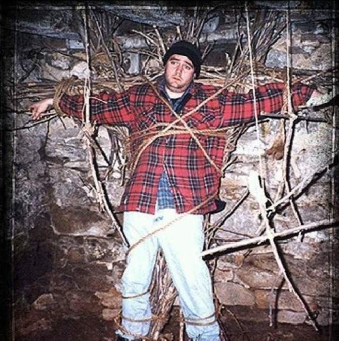 Майкл С. Уильямс на съёмках фильма Ведьма из Блэр: Курсовая с того света 1999 год.