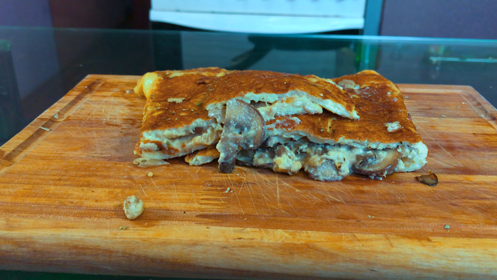 Шаг 6: Разогреваем сковороду смазанную масло и на средне-высоком огне готовим омлет. При этом у нас появляются пузыри, которые можно разрезать и в них затечёт жидкий омлет. Также можно приподнимать края омлета, когда они окрепнут и в освободившееся пространство устремиться жидкий омлет.