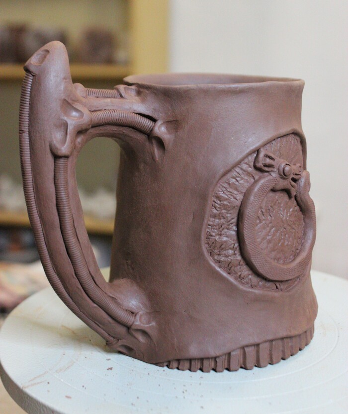 Собирал я эту кружечку из пластов керамической массы. Толщина пластов 5 мм. Пять дней сушки и четыре обжига не считая молочного. Обжигов было так много т.к. глазури по непонятным причинам ломали мне мозг.