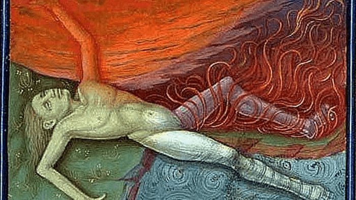 Чисто средневековая картина: человек объелся спорыньи, у него на теле появились язвы, живот вспух, он начал вести себя агрессивно, периодически дёргаться в конвульсиях. Никто не разбирался, что это на самом деле алкалоиды в спорынье вызывают сокращения капилляров в конечностях, из-за чего и случаются конвульсии. Для средневекового жителя это "ведьмина корча", а потому беднягу надо сжечь на костре.